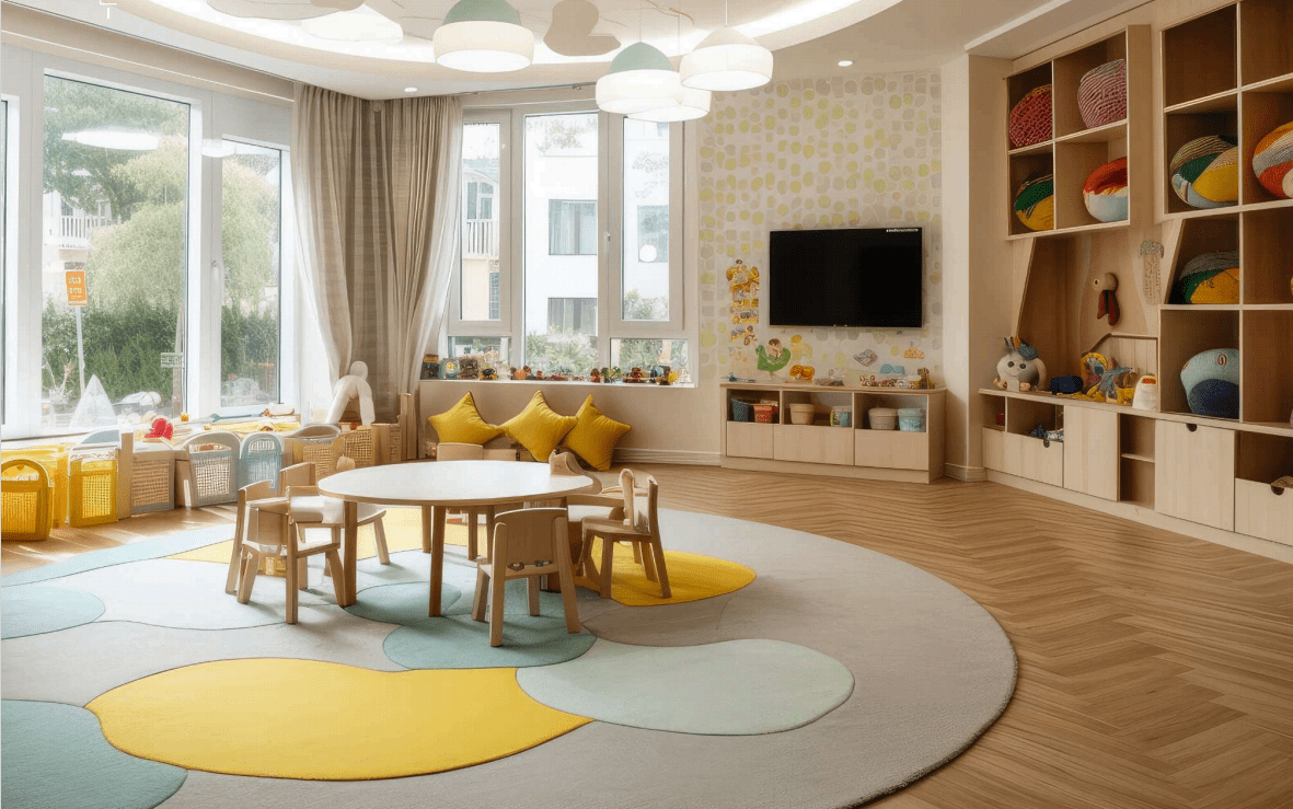 * In-house baby care center with rained supervision, toys and activities